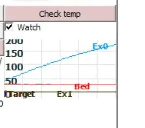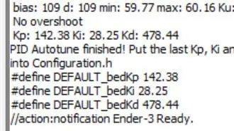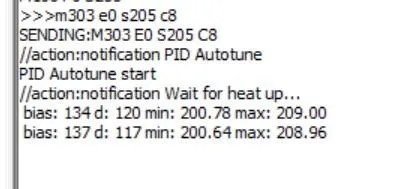 Empezará a calentar la primera boquilla (E0) y circulará alrededor de la temperatura objetivo 8 veces (C8) a la temperatura dada (S205) Devolverá valores para P I y D (esto demora un tiempo) Este proceso se puede observar en el gráfico de temperatura y también en la consola, donde cada vez que hagas la prueba se devolverán los valores PID.