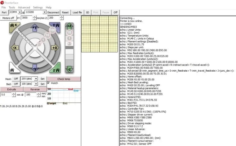 Con el hotend a temperatura ambiente y la impresora conectada a PRONTERFACE, enviamos el siguiente comando: M303 E0 S205 C8