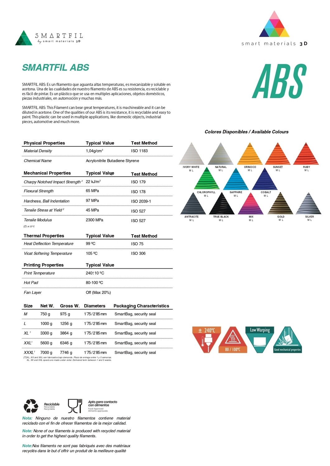 Se trata de un ABS especialmente aditivado para poder reducir la temperatura de la cama caliente hasta 60ºC. Minimiza el warping y el cracking. Excelente estabilidad dimensional y regularidad en la impresión.